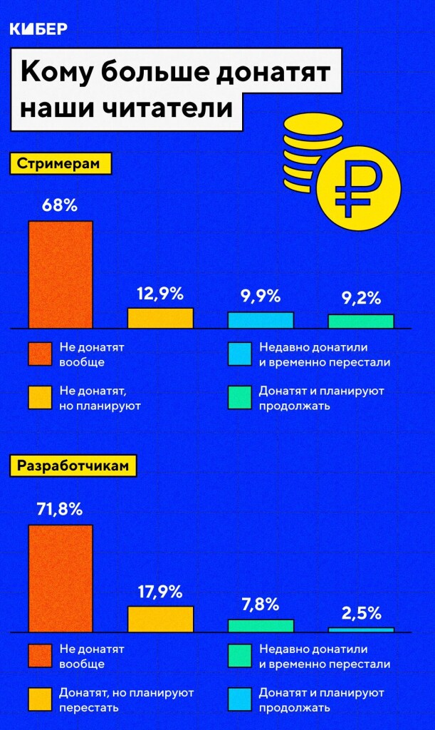 Донаты геймеры чаще переводят стримерам, чем разработчикам игр. Самыми«щедрыми» геймерами авторы исследования называют людей 18-24 лет с доходомболее 100 тыс. руб. в месяц. Среди них 17,6% принципиально не донатят – всреднем этот показатель почти в два раза больше. Больше всего респондентов вэтой подгруппе тратят на донаты от 1 до 5 тыс. руб. в месяц – 35,3%. Здесь жеоказалась наибольшая доля геймеров, готовых донатить более 25 тыс руб. в месяц– 7,8%. Люди с аналогичным уровнем дохода в возрасте от 25 до 34 лет переводятменьше: среди них 55,6% респондентов вообще не донатят. При этом донатеры вэтой подгруппе предпочитают ограничиваться минимальными суммами.