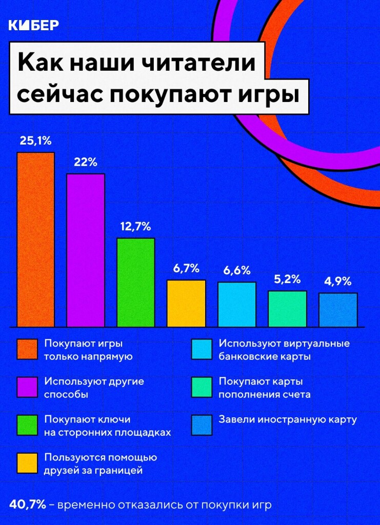 Физические игровые товары (гаджеты, технику, игры на дисках) после 24февраля купили только 15,1% опрошенных. Сами игры только напрямую покупаютчетверть респондентов, еще 22% используют другие способы приобретения. В целом40,7% опрошенных временно отказались от покупки игр.