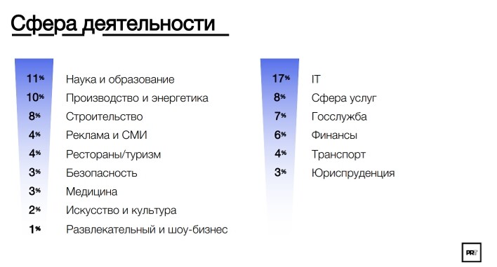 - Самое большое количество респондентов заняты в сферах IT (18%), наука иобразование (11%), производство и энергетика (10%). Меньше всего опрошенныхработают в области культуры и искусства (2%) и шоу бизнесе (1%);