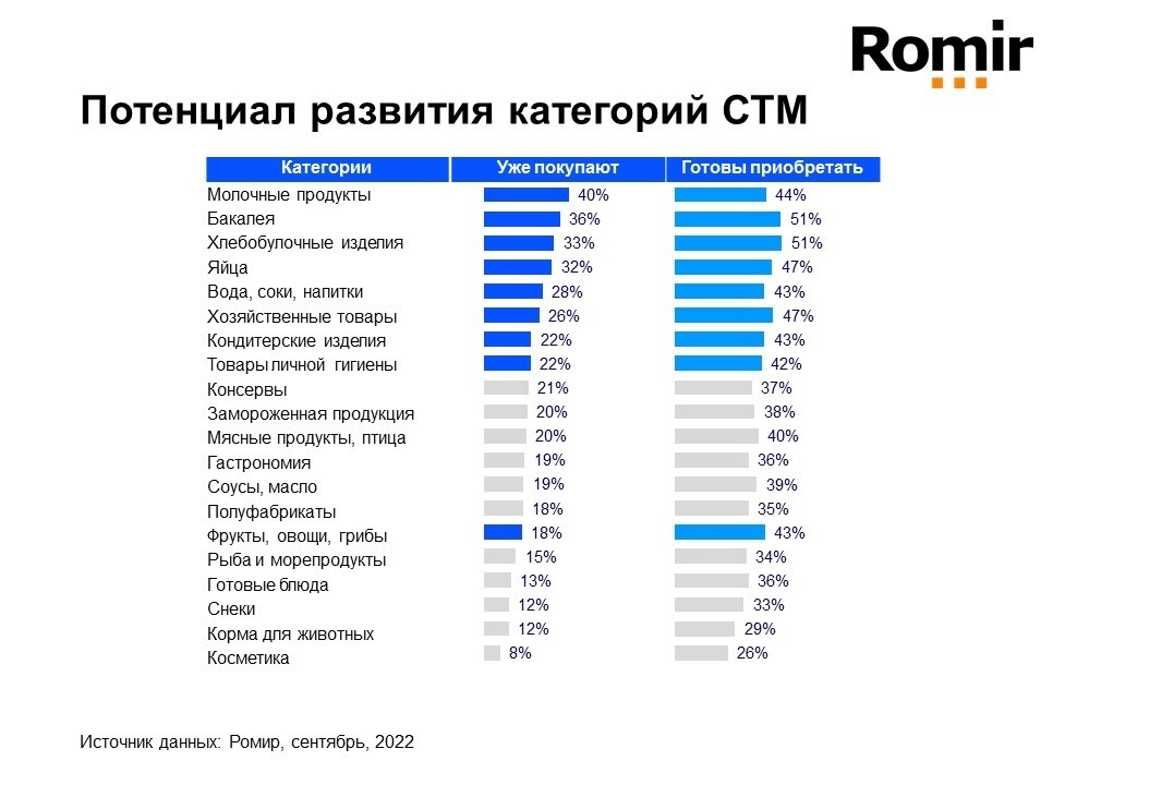 Почти половина опрошенных заявила, что товары собственных торговых марокрозничных сетей полностью отвечают их нуждам и запросам (47%). Чаще всегопотребители выбирают молочные продукты (40%), бакалею (36%), хлебобулочныеизделия (33%). Спрос не удовлетворен предложением в категории «фрукты, овощи,грибы». Только 18% покупателей выбирают СТМ в этой категории, но 43% хотели быделать покупки в этом сегменте.