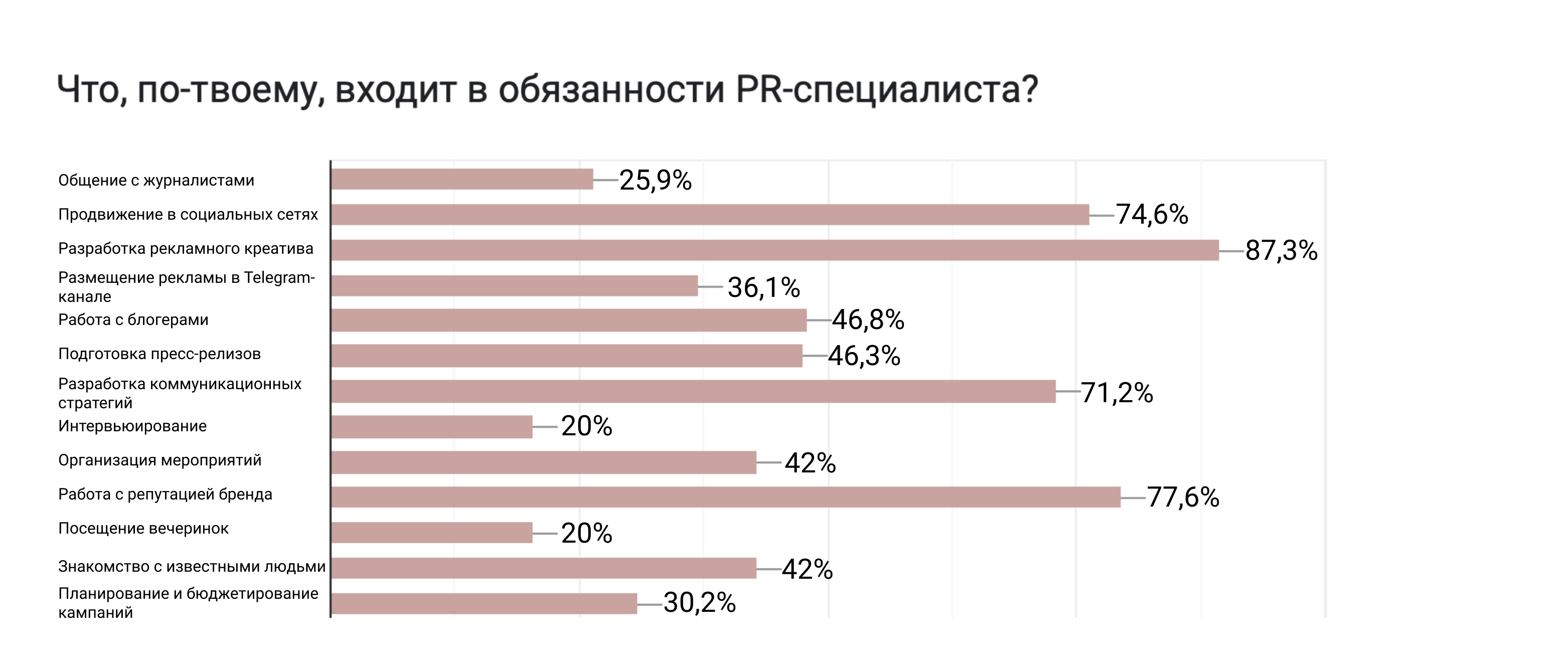 Подавляющее большинство (87%) первокурсников считают, что в обязанности PR-специалиста входит разработка рекламного креатива, а вторым и третьим по популярности ответами стали работа с репутацией бренда (77,6%) и продвижение в социальных сетях (74,6%). Подготовку пресс-релизов и общение с журналистами упомянули 46,3% и 25,9% соответственно.