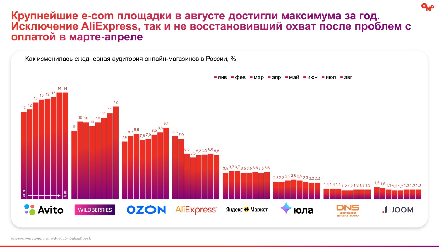 В потреблении интернет-контента эксперты выделили внушительный августовскийрост охвата крупнейших е-ком площадок. Исключение AliExpress, так и невосстановивший охват после проблем с оплатой в марте-апреле.