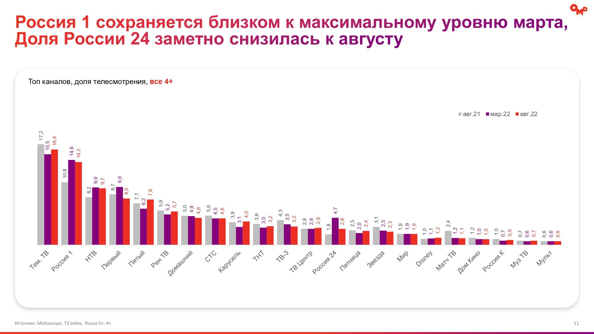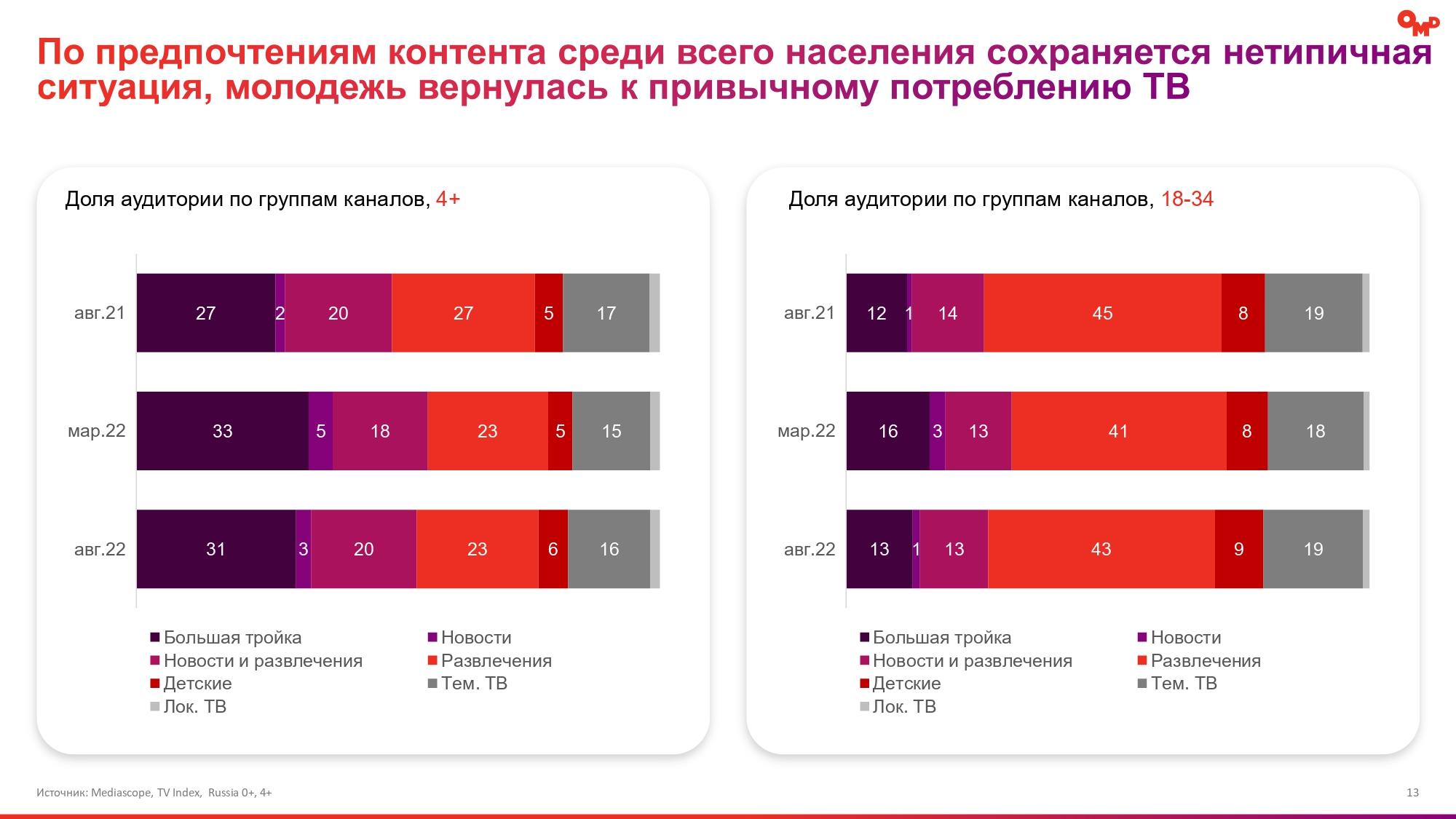 Сами каналы начали заявлять об аккуратном возвращении развлекательногоконтента в эфир в новом телесезоне. Новости, которых в эфире «большой тройки»все еще на 60% больше, чем было до кризиса, все меньше интересуют зрителей. Врезультате с июля продолжается снижение общего телесмотрения. Зрители ввозрасте 18-34 выбирают развлекательный контент из имеющегося: суммарная доляразвлекательных и детских каналов вернулась к уровню 2021.
