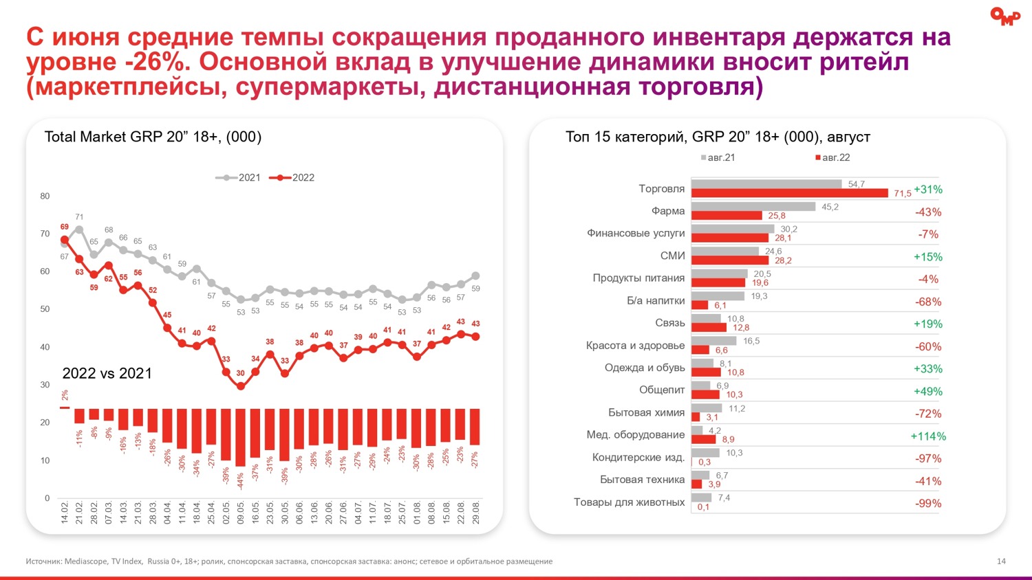 Средние темпы сокращения проданного на ТВ инвентаря держатся на уровне -26%с июня. Сильнее всего в августе просела реклама товаров для животных икондитерских изделий, объемы которых упали к прошлому году на 99% и 97%соответственно. За ними идут: бытовая химия (-72%), безалкогольные напитки(-68%), красота и здоровье (-60%). В улучшение динамики основной вклад вноситонлайн- и офлайн-ретейл с ростом более 30%.