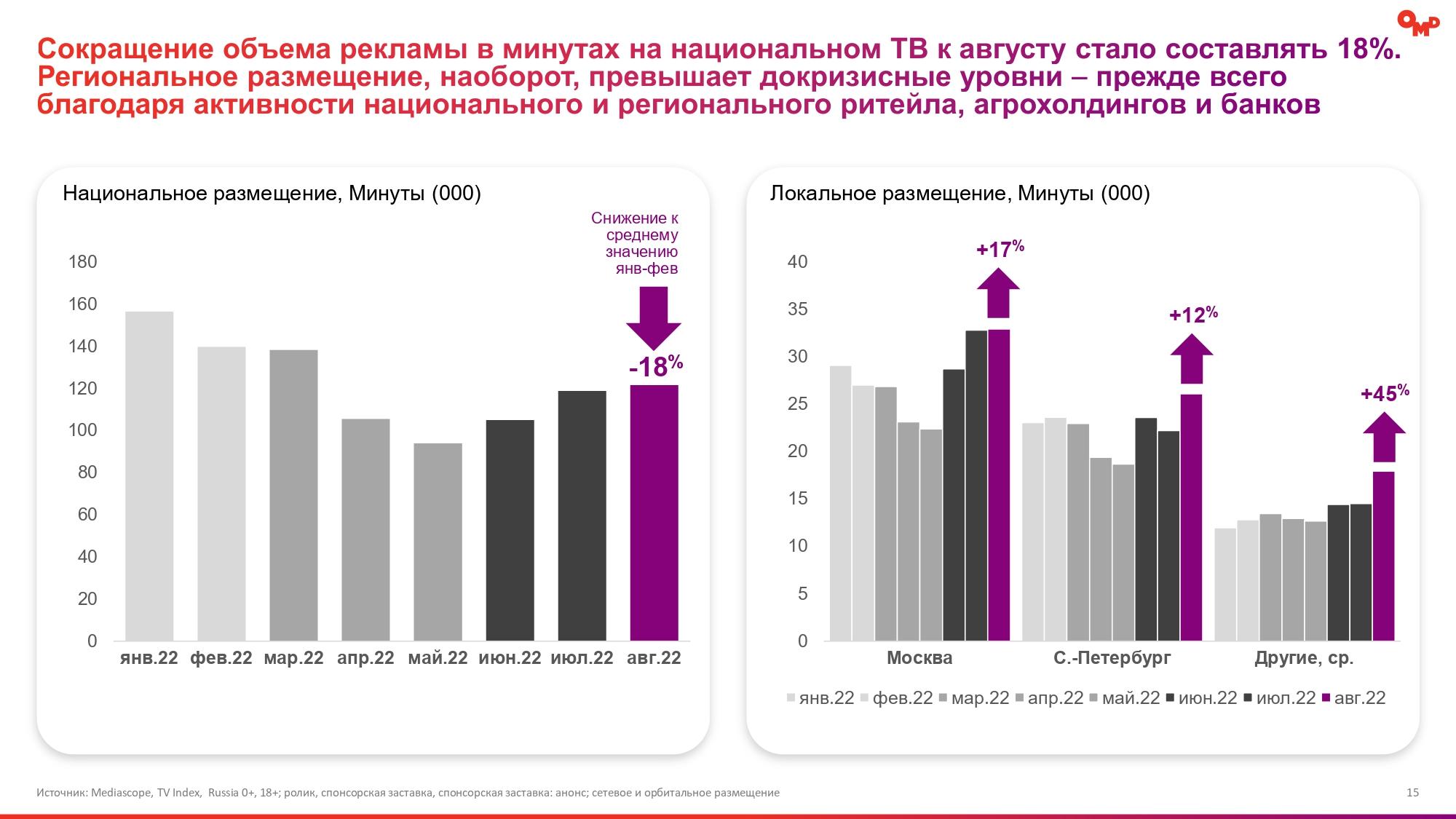 Объем рекламы на локальном ТВ вырос в летние месяцы, следует из исследованияOMD OM, составленного на основе данных Mediascope, включающих показатели повсей России среди аудитории старше 18 лет. Самый заметный рост пришелся наавгуст, когда размещения в Москве выросли к январю-февралю этого года на 17%, вСанкт-Петербурге на 12%, на других региональных телеканалах — на 45%.
