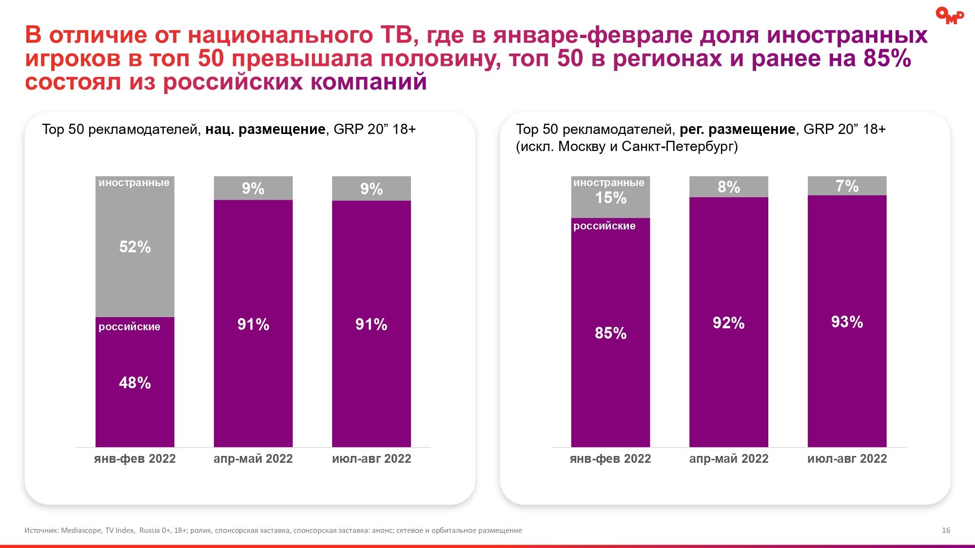 - Освоение свободных территорий. Многие иностранные компанииоставили традиционные для себя проекты: Авто – тема путешествий; пивные бренды– поддержка спорта; многие ушедшие бренды продвигали повестку sustainability,которая будет оставаться актуальной для части потребителей и т.д. Для брендовоткрывается возможность вступить в игру на этих территориях, выстраиваяэмоциональную связь с разными сегментами потребителей.