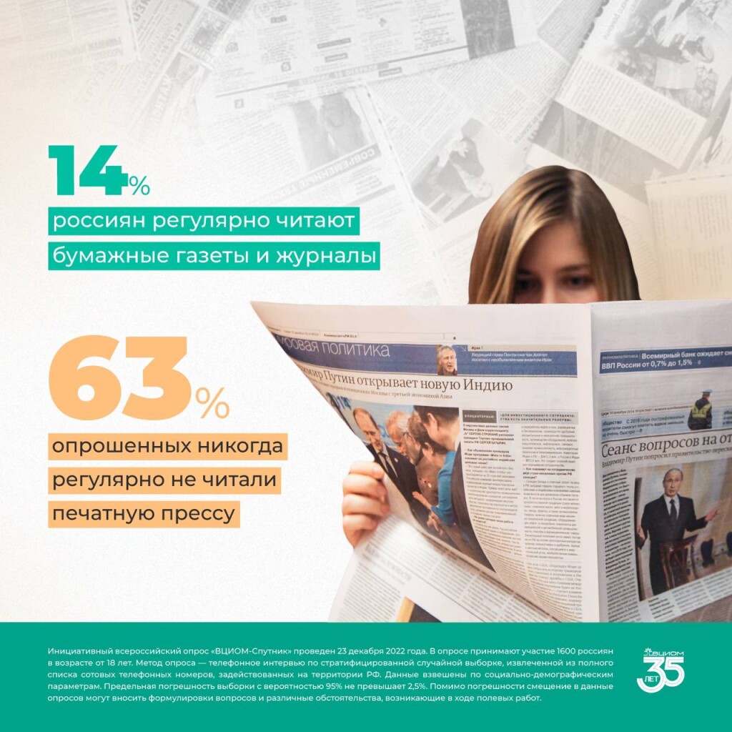 В целом же газеты и журналы в бумажном виде регулярно читают 14%россиян.