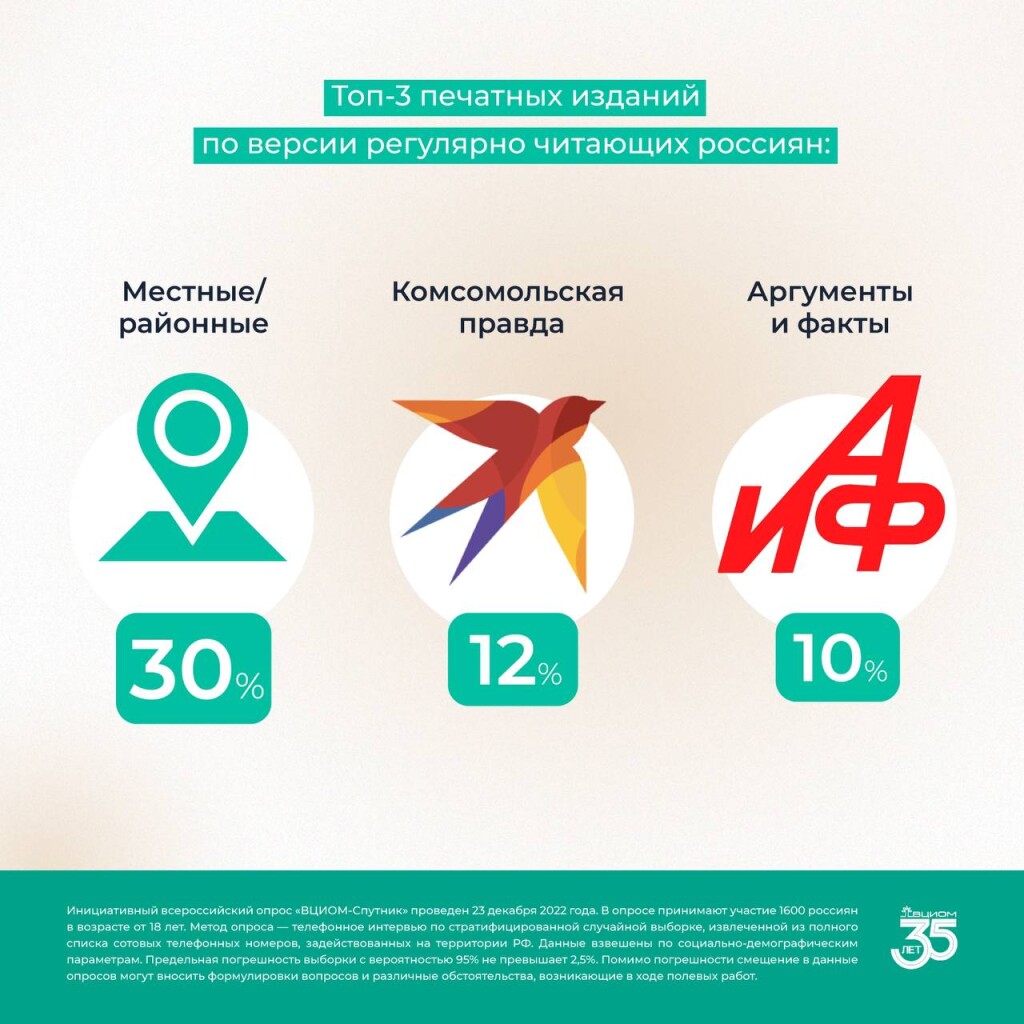 Самыми популярными изданиями среди регулярно читающих прессу россиян, сталиместные и районные газеты — их читают 30% опрошенных. На втором месте«Комсомольская Правда» с результатом 12%. Наименьший показатель у «Аргументов ифактов» — 10%.