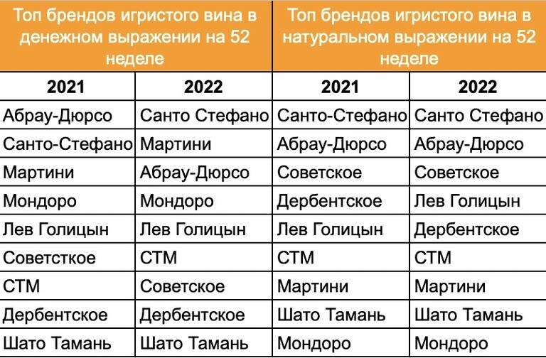 В целом во время предновогодней недели в 2022 г., россияне скупили 15%годового оборота игристых вин, следует из отчета NielsenIQ. Лидером по продажамв денежном выражении стала марка «Санто Стефано», сместив с первого места«Абрау-Дюрсо». На второе место поднялся «Мартини», а «Абрау-Дюрсо» упал натретье.