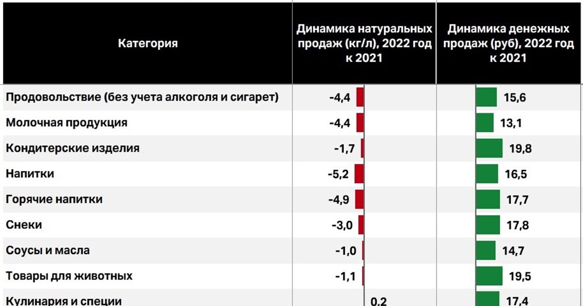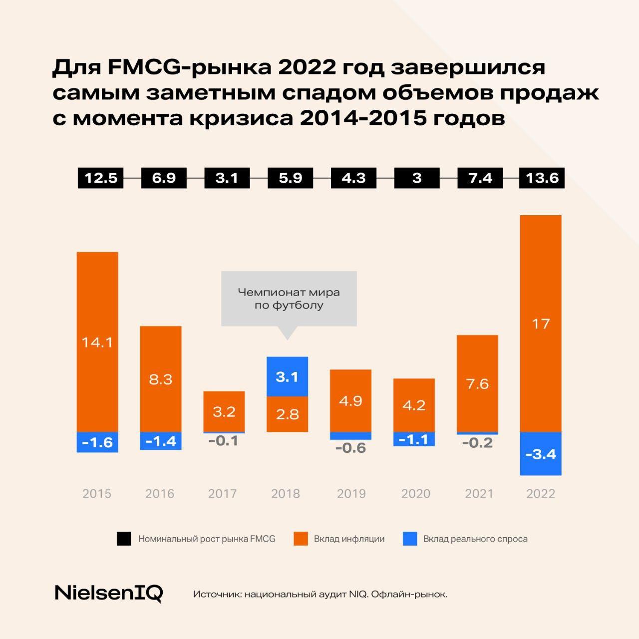 FMCG-рынок в России показал существенное уменьшение объемов продаж с моментакризиса в 2014–2015 гг. Итоги 2022 г. основаны на полном аудите FMCG-розницы повсей России, включающем более 200 торговых сетей. Об этом говорится висследовании NielsenIQ.