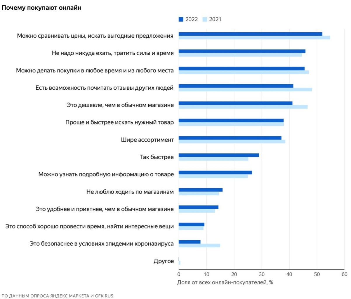Сравнение цен и экономия сил стали основными факторами для покупки онлайн уроссиян. Об этом сообщают результатысовместного исследования «Яндекс.Маркета» и аналитической компании GfK.При этом поиск выгодных предложений начинает терять актуальность. В прошломгоду возможность сэкономить интересовала 52% опрошенных, это на 2,8% меньше,чем в 2021 г.