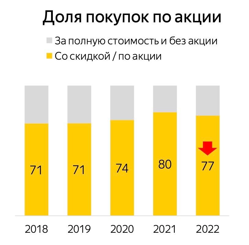 Доля онлайн-покупок по акции впервые снизилась за последние пять лет. Если в2021 г. 80% онлайн-покупателей отмечали, что их последняя покупка в интернетебыла со скидкой, то в 2022 г. доля снизилась до 77%. В 2018–2019 гг. этотпоказатель держался на уровне 71%, а затем рос вплоть до 2021 г. Наиболеепривлекательная для россиян акция — бесплатная доставка. На втором месте —скидки, на третьем — кешбэк.