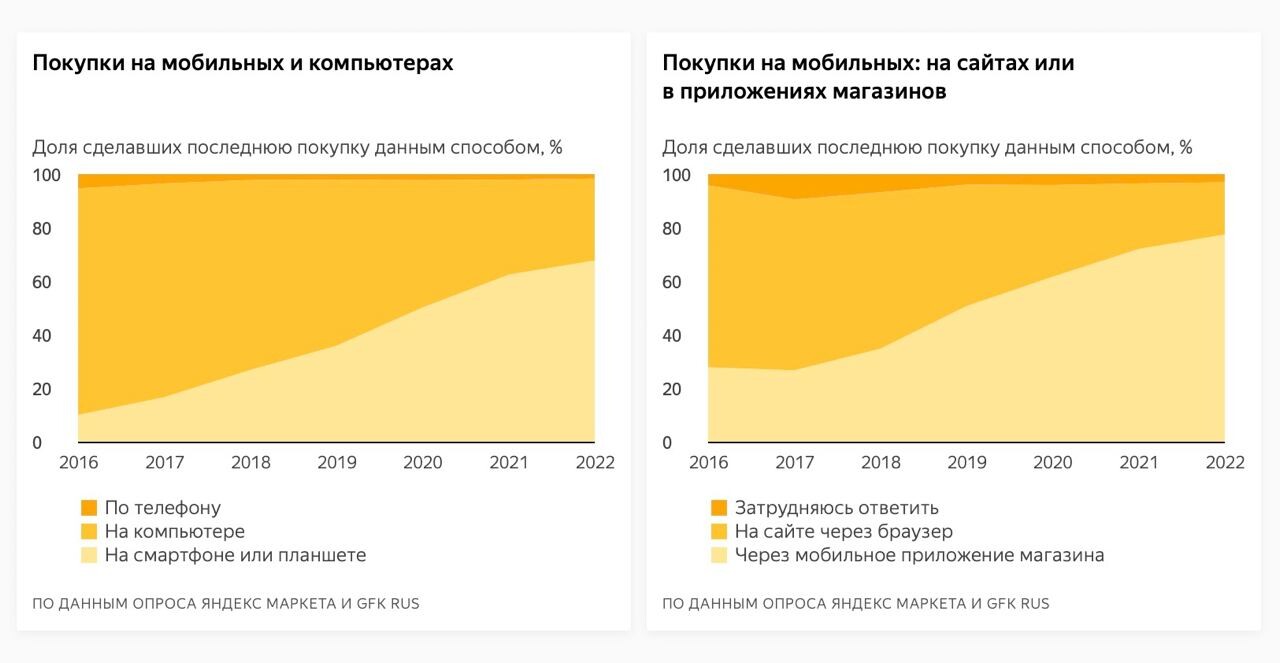 Доля покупок в онлайн-магазинах со смартфонов и планшетов превысила67%. Со смартфонов чаще всего приобретают продукты, детскую одежду итовары для ухода за малышами, декоративную косметику и парфюмерию. Покупая смобильных, люди почти в четыре раза чаще пользуются приложениями магазинов, чемсайтами. Доля заказов, совершенных с ПК (персональный компьютер), в два разаменьше — 31%. С ПК продолжают заказывать электронику и бытовуютехнику.