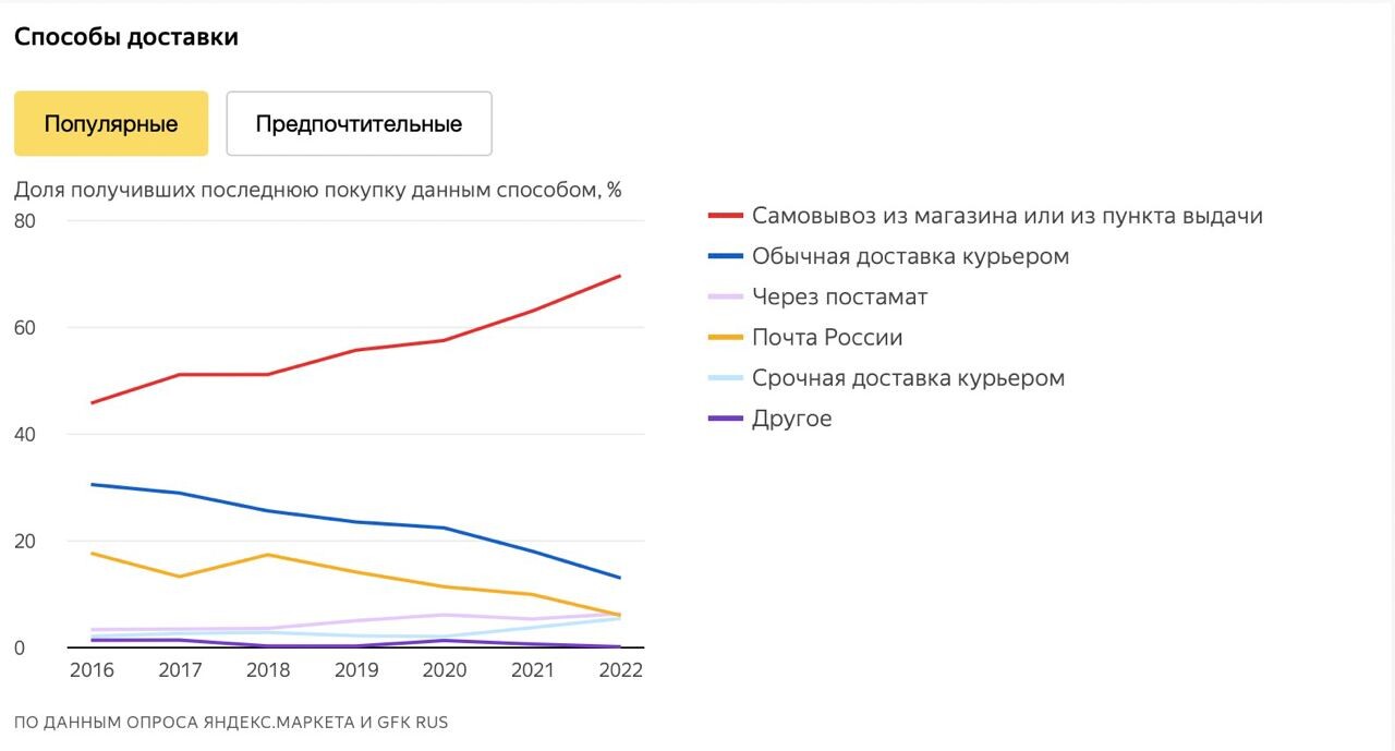 Потребители предпочитают пользоваться самовывозом. Так, 74%онлайн-покупателей хотя бы раз за последний год пользовались самовывозом изпункта выдачи заказов или магазина. В 2022 г. этот показатель вырос на 2 п. п.по сравнению с 2021 г. (по сравнению с 2019 г. — на 5 п. п.).