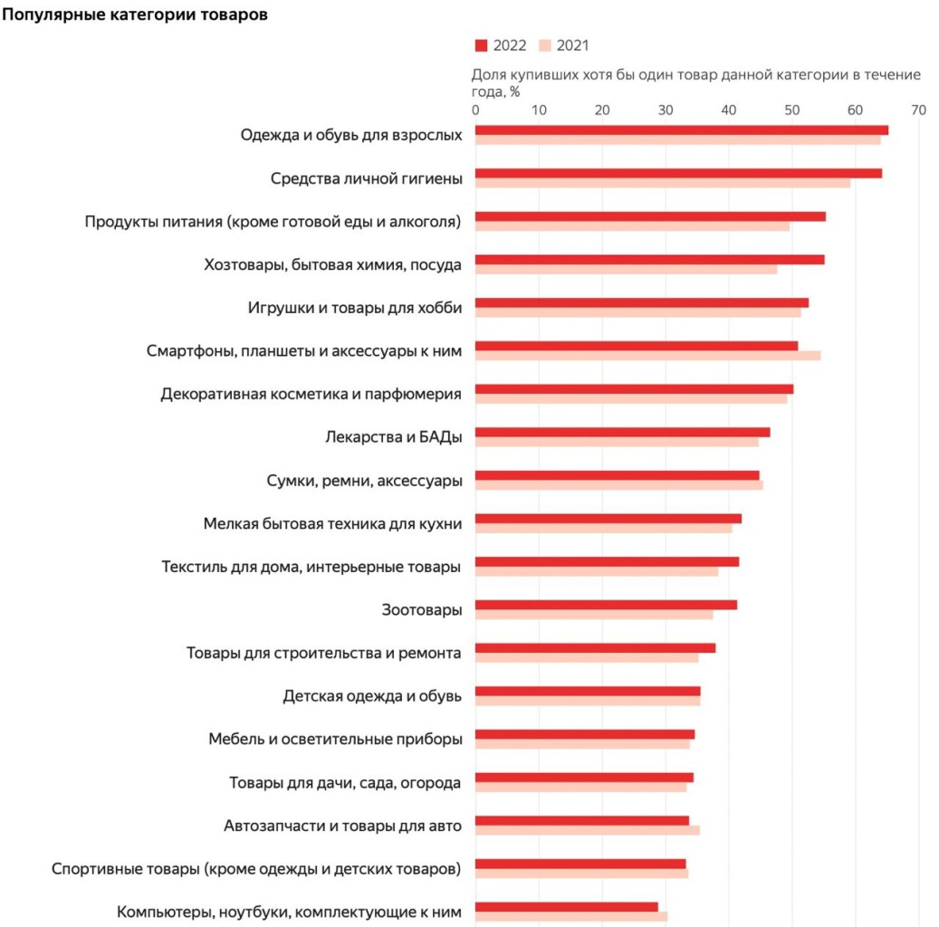 Также аналитики выделили топ категорий в онлайн-магазинах. Самый популярныйсегмент товаров — одежда и обувь для взрослых: эти товары хотя бы раз в течениегода покупали онлайн более 65% респондентов. На втором месте — средства личнойгигиены (64%). На третьем — продукты питания (55%).