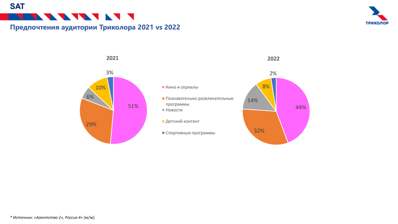 Киносериальный контент остается самым востребованным на федеральных итематических каналах, несмотря на отток аудитории и дефицит зарубежногоконтента. Однако впервые за последние четыре года спрос на кино и сериалыопустился ниже 50% — до 44%.