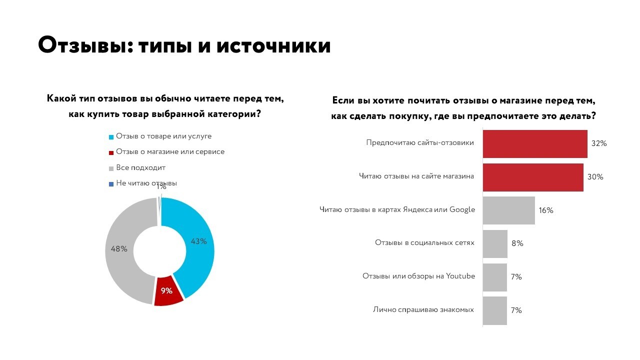 Почти 80% доверяют обзорам на товар, которые написаны обычными покупателями.Треть пользователей доверяет магазинам, специализирующимся на товаре, и околочетверти ― независимым экспертам.