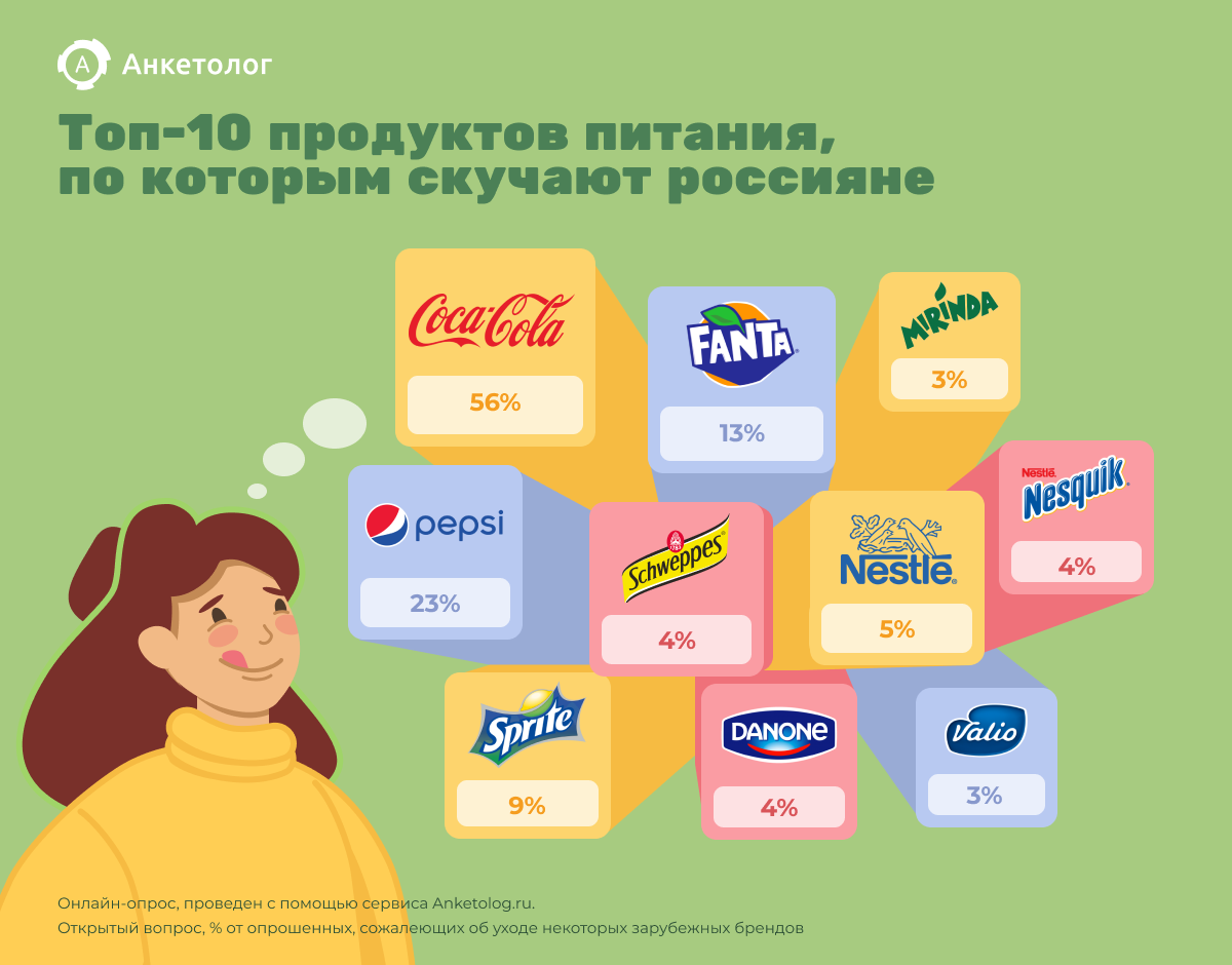 После ухода зарубежных продуктовых брендов россияне больше всего скучают погазированным напиткам — Coca-Cola (56%), Pepsi (23%), Fanta (13%), Sprite (9%),Schweppes (4%) и Mirinda (3%), несмотря на наличие российских аналогов,согласно данным опроса«Анкетолога».