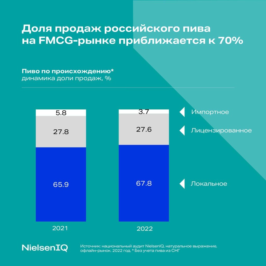 Доля продаж отечественных марок пива в России по итогам 2022 г. достиглапочти 68%. И увеличилась на два процентных пункта по сравнению с 2021 г.согласно данным Nielsen.