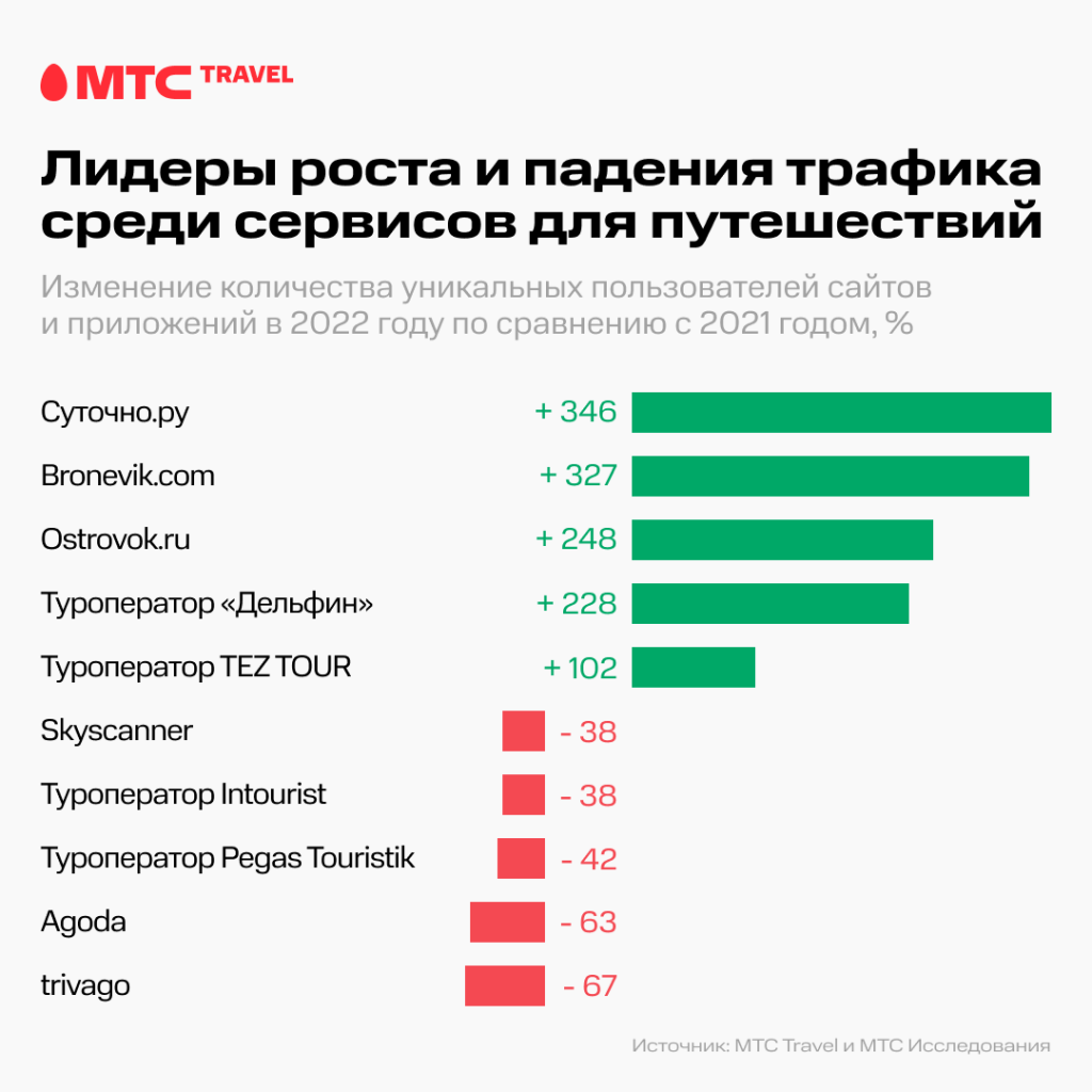 Количество уникальных пользователей у сервиса «Суточно.ру»,специализирующегося на аренде апартаментов, выросло в 4,5 раза по сравнению с2021 г. Вторым по приросту аудитории стал входящий в МТС Travel сервисBronevik.com — за 2022 г. его аудитория увеличилась в 4,3 раза. А числоинтернет-пользователей Ostrovok.ru выросло в 3,5 раза год к году.