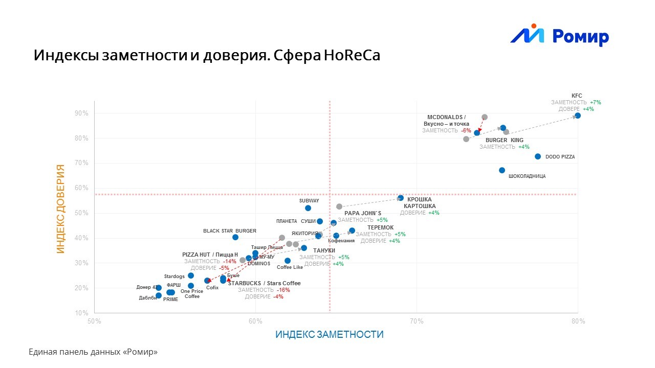 Наиболее значимое повышение индекса доверия и заметности показали KFC,Burger King, «Крошка Картошка», «Тануки», «Папа Джонс» и «Теремок». В то жевремя показатели «Вкусно — и точка», «Пицца Н» (ранее Pizza Hut) и StarsCoffee (бывший Starbucks) сильно снизились по сравнению с 2020 г.