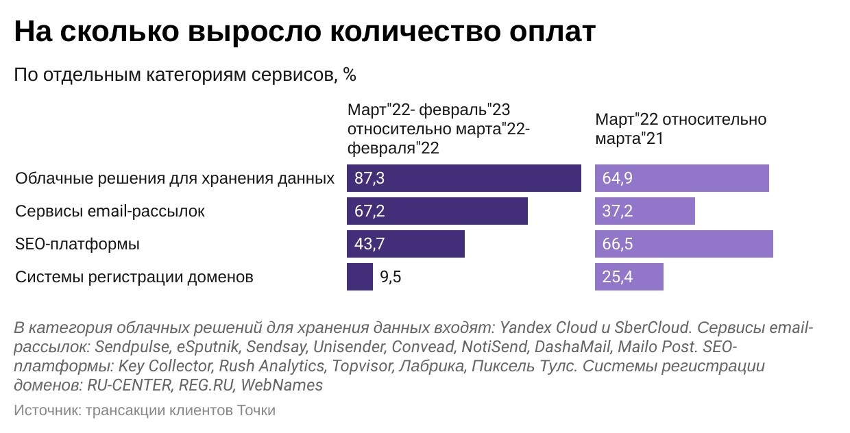 Аналитики изучили данные 12 тыс. клиентов «Точки», которые производилиоплаты за отечественные и имеющие российские филиалы сервисы в 2022–2023 гг. Ив январе — феврале 2023 г. провели опрос, в котором приняли участие 302digital-специалиста — руководители отделов маркетинга и линейные специалисты(интернет-маркетологи, PPC-менеджеры, SMM-менеджеры).