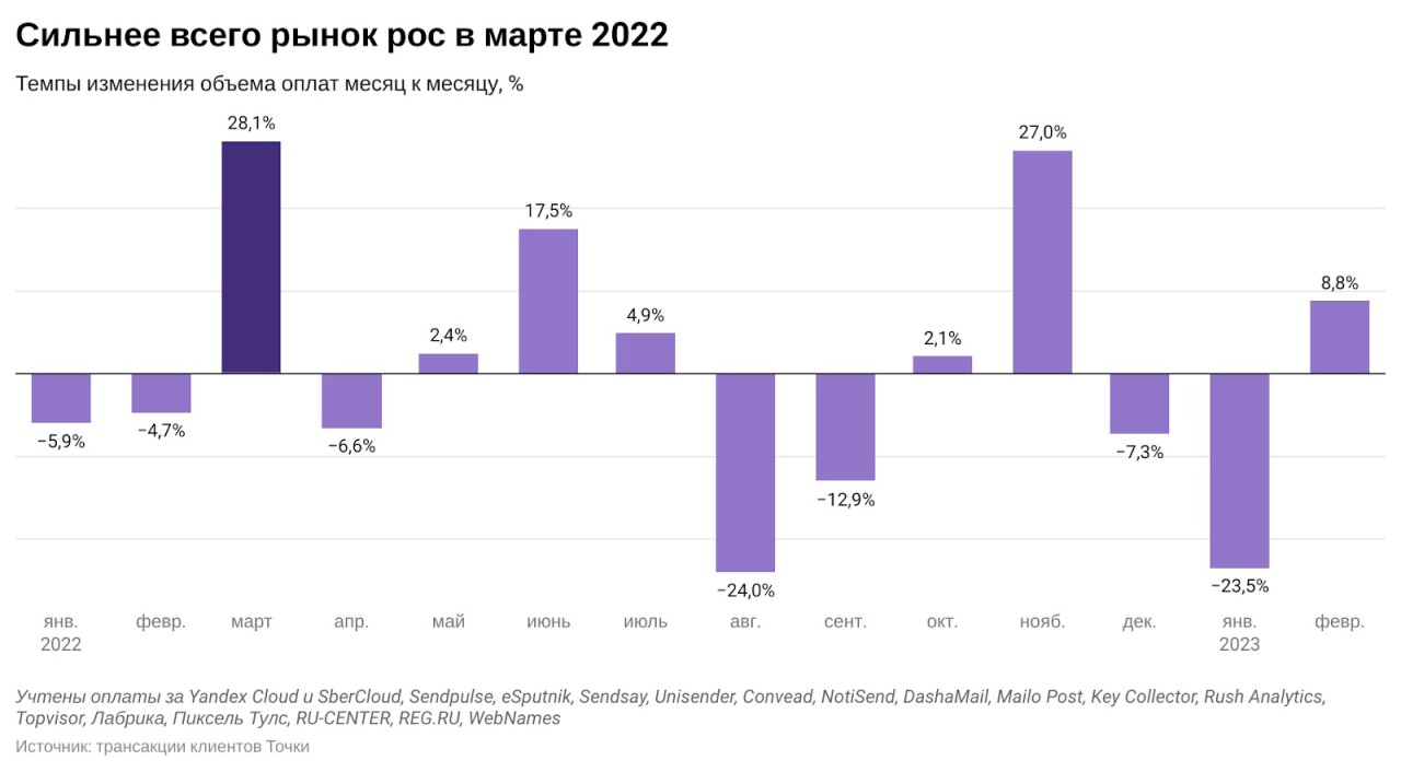 Если смотреть на темпы роста рынка, то сильнее месяц к месяцу он вырос тожев марте 2022 г. — на 28,1% относительно февраля 2022 г. В феврале 2023 г. ростзафиксирован на уровне 8,8% относительно предыдущего месяца. Эксперты связалитакую тенденцию с тем, что на фоне резкого ухода из РФ зарубежных сервисовпредприниматели начали экстренно искать аналоги на отечественномрынке.