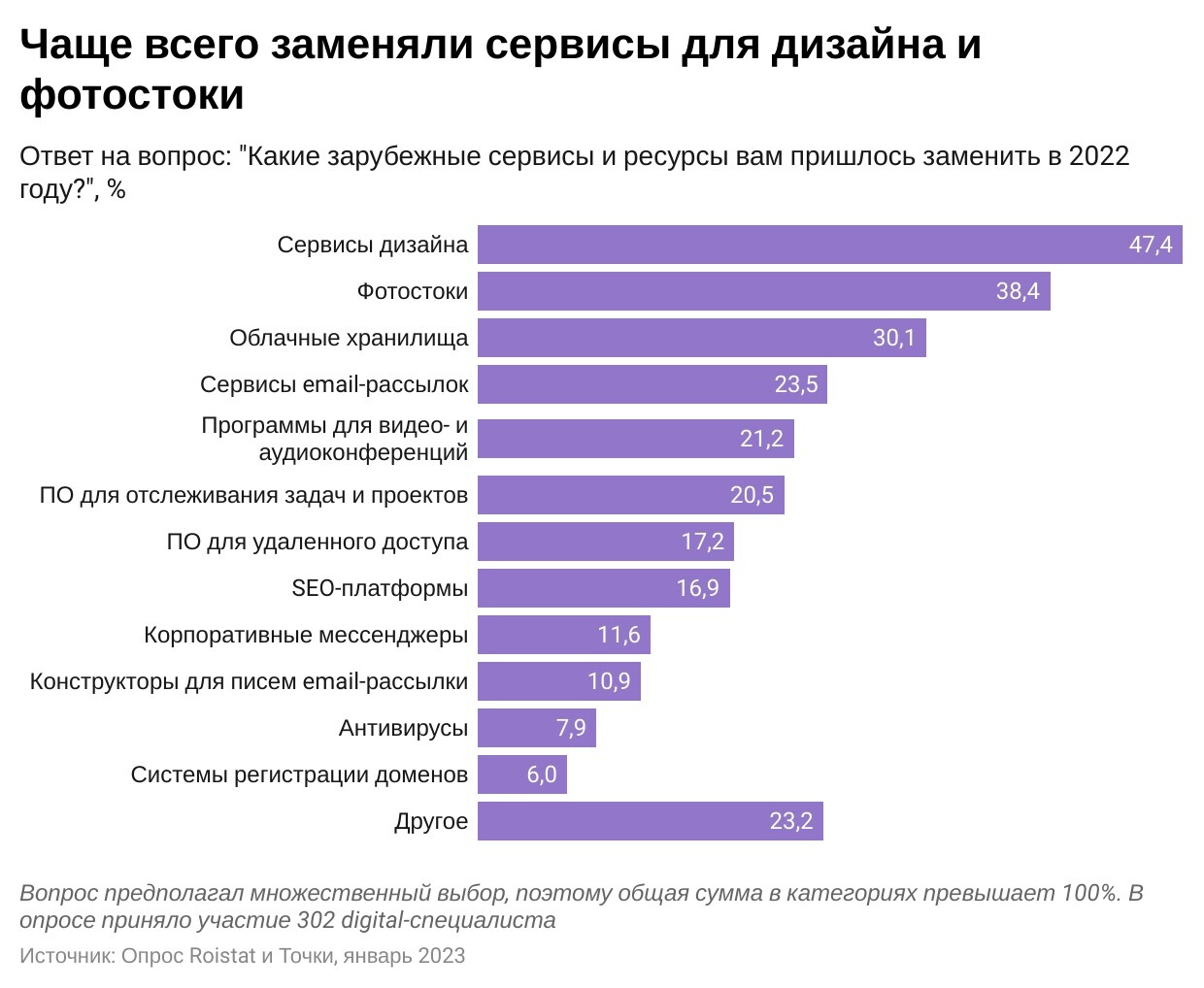 В топ-5 зарубежных сервисов, которые пришлось заменить digital-специалистамв 2022 г., вошли сервисы дизайна — 47,4%, фотостоки — 38,4%, облачные хранилища— 30,1% сервисы e-mail-рассылок — 23,5%, программы для видео- иаудиоконференций — 21,2%.