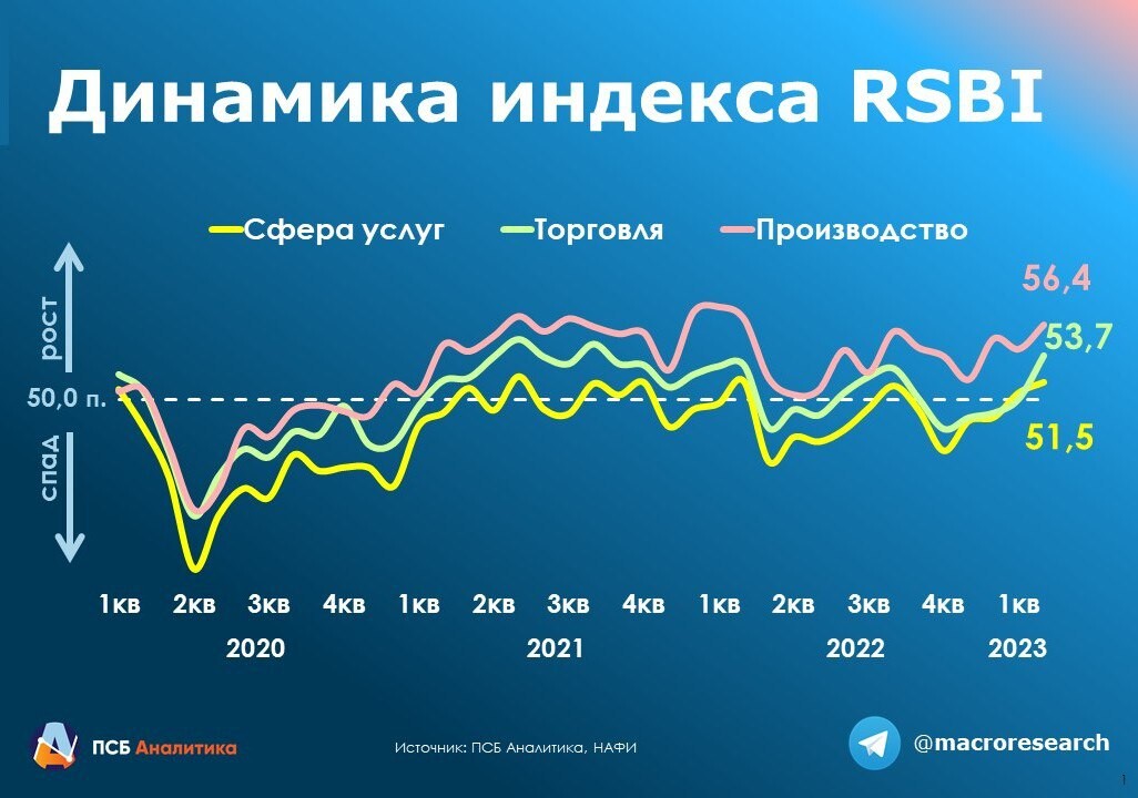 Наибольший рост показал производственный сектор, его индекс достиг 56,4 п.п.На втором месте торговый сегмент с результатом 53,7 п.п. На положительнуюдинамику повлияли улучшение ожиданий по продажам, кадрам, инвестициям икредитам, отмечают эксперты.