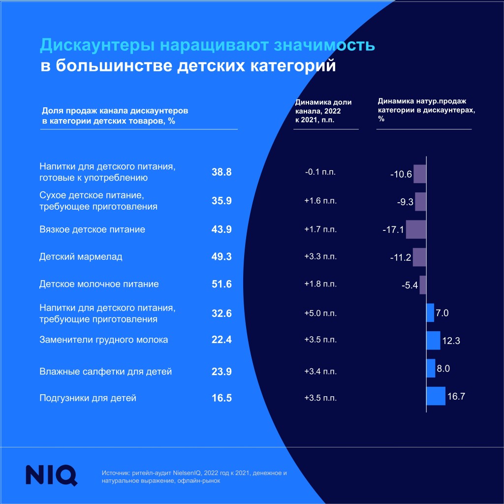 Доля продаж детского молочного питания в дискаунтерах составила 51,6% в 2022г. В категории подгузниках и заменителях грудного молока схожая тенденция.Динамика натуральных продаж подгузников увеличилась на 16,7%, а заменителейгрудного молока на 12,3% год к году. Эксперты указывают на то, что популярностьдискаунтеров растет в большинстве детских категорий и отражает тренд наэкономию.