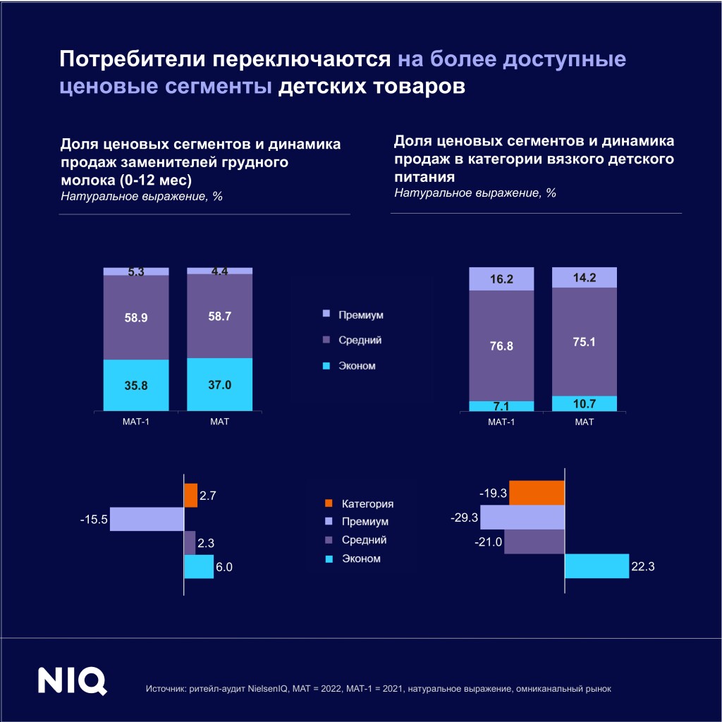 Продажи товаров для детей на онлайн- и офлайн-рынках в 2022 г. снизились вобъемах на 7,9% к 2021 г. В денежном выражении показатель увеличился на 10,5%,однако это почти вдвое ниже среднего уровня продаж на FMCG-рынке. Об этомговорится в результатах исследования NielsenIQ.