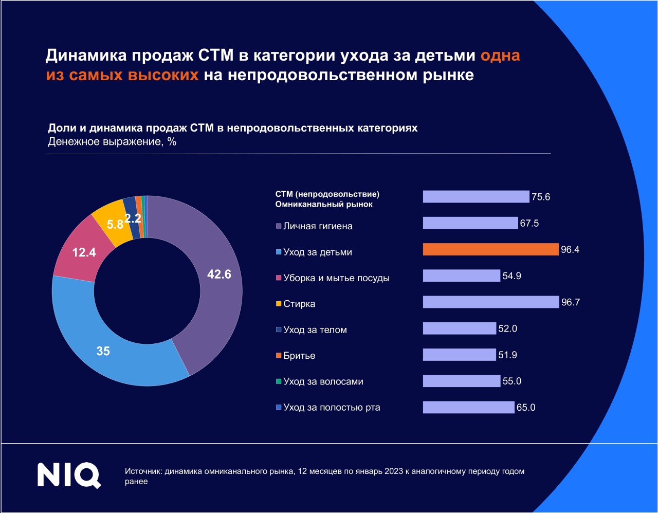 Доля денежных продаж частных марок в категории ухода за детьми составила 35%к началу 2023 г., заняв второе место среди непродовольственных товаров. Приэтом темпы роста продаж сетевых марок этого сегмента выросли практически вдвое.Наибольший прирост доли СТМ заметен в сегменте подгузников. В этой категориидоля натуральных продаж под частными марками составляла 15% от общих продаж в2021 г., за прошлый год их доля увеличилась вдвое и достигла 30% наофлайн-рынке.