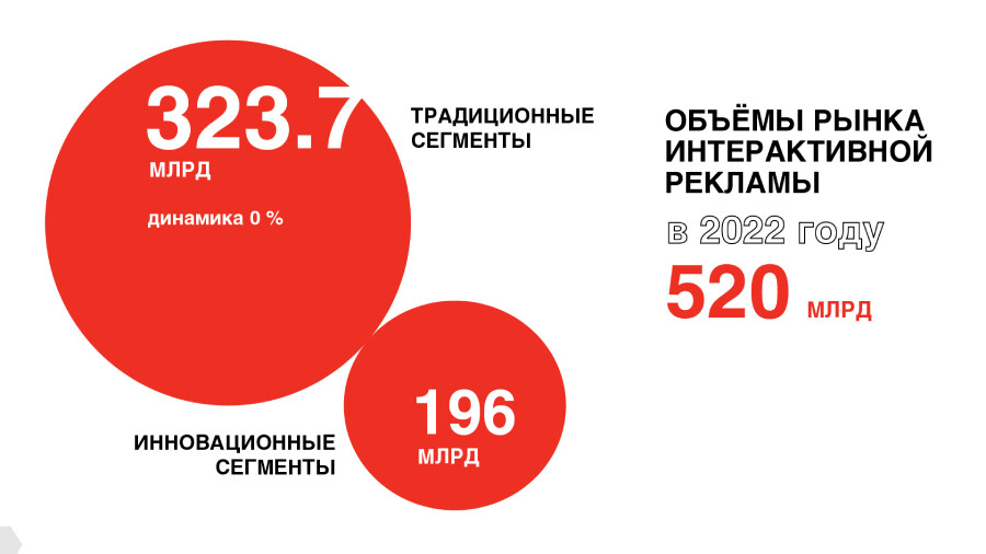 Объем традиционных сегментов за прошлый год сохранился на отметке в 323,7млрд руб. Расходы рекламодателей на инновационные сегменты составили 196 млрдруб. Таким образом, общий объем рынка интерактивной рекламы составил 520 млрдруб. Это следует из отчета Ассоциации развития интерактивной рекламы(АРИР).