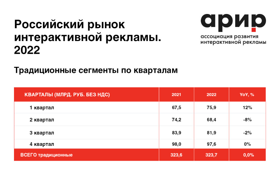 К традиционным сегментам относятся: performance-реклама (поисковая реклама,CPx, video instream и video outstream) и branding-реклама (banners, videoinstream, video outstream). В первом квартале 2022 г. перечисленные категориивыросли на 12%, в сравнении с аналогичным периодом 2021 г. Во втором кварталепроизошел спад на 8%, в третьем — на 2%. В последние три месяца динамикадошла до нулевых значений.