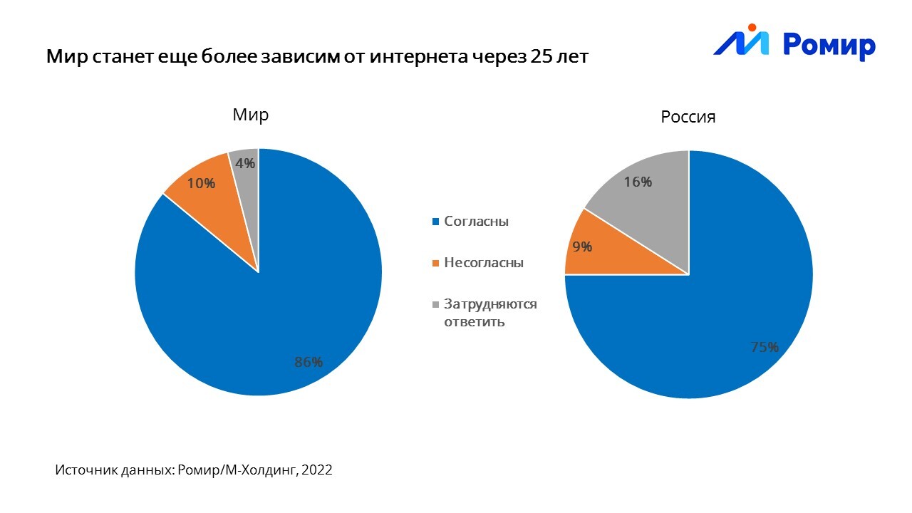 В России 75% считают, что в будущем мир будет еще больше зависеть отинтернета. При этом чаще всего об этом говорят представители старшего поколения— 60 лет и старше.