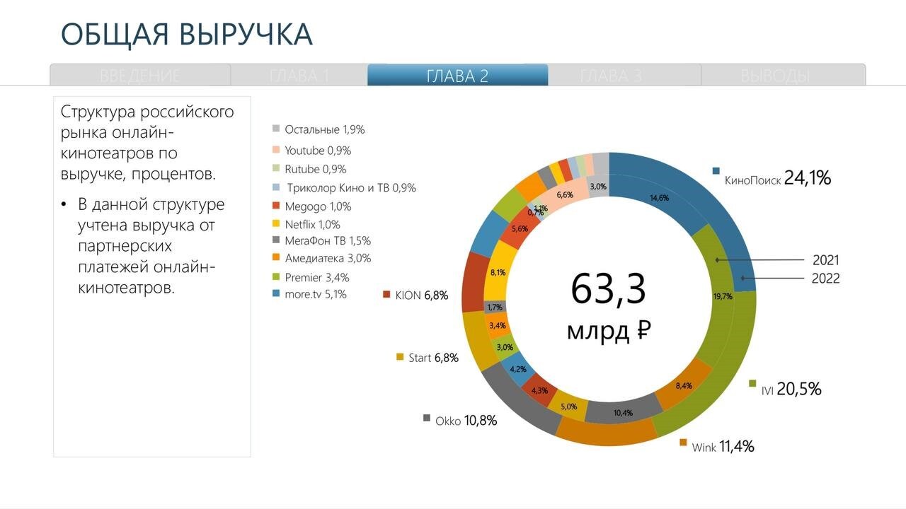 Онлайн-кинотеатру IVI, который увеличил долю выручки по сравнению с прошлымгодом — 20,5% против 19,7%, не хватило этого, чтобы удержать лидерство. Напервое место вышел «Кинопоиск» — 24,1% (по итогам 2021 г. — 14,6% рынка вденьгах).