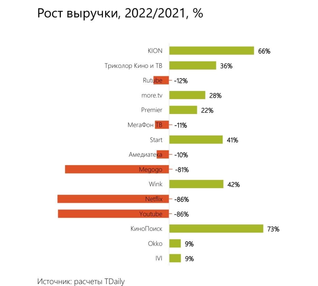 «Кинопоиск» вырос на 73%, Kion — на 66%, Wink — на 42%, Start — на 41%,«Триколор Кино и ТВ» — на 36%. Годом ранее эти проекты по росту выручки шлировно так же друг за другом, только тогда пятое место занимал Netflix, аонлайн-кинотеатр «Триколора» был шестым.