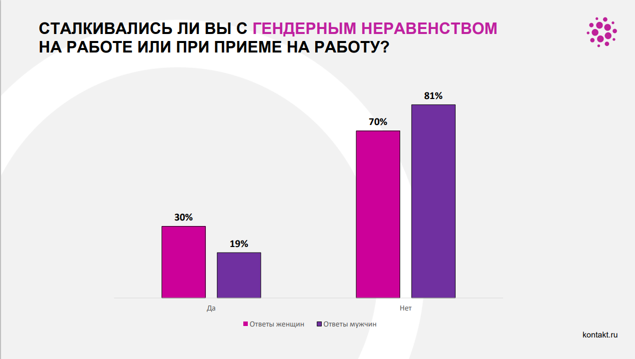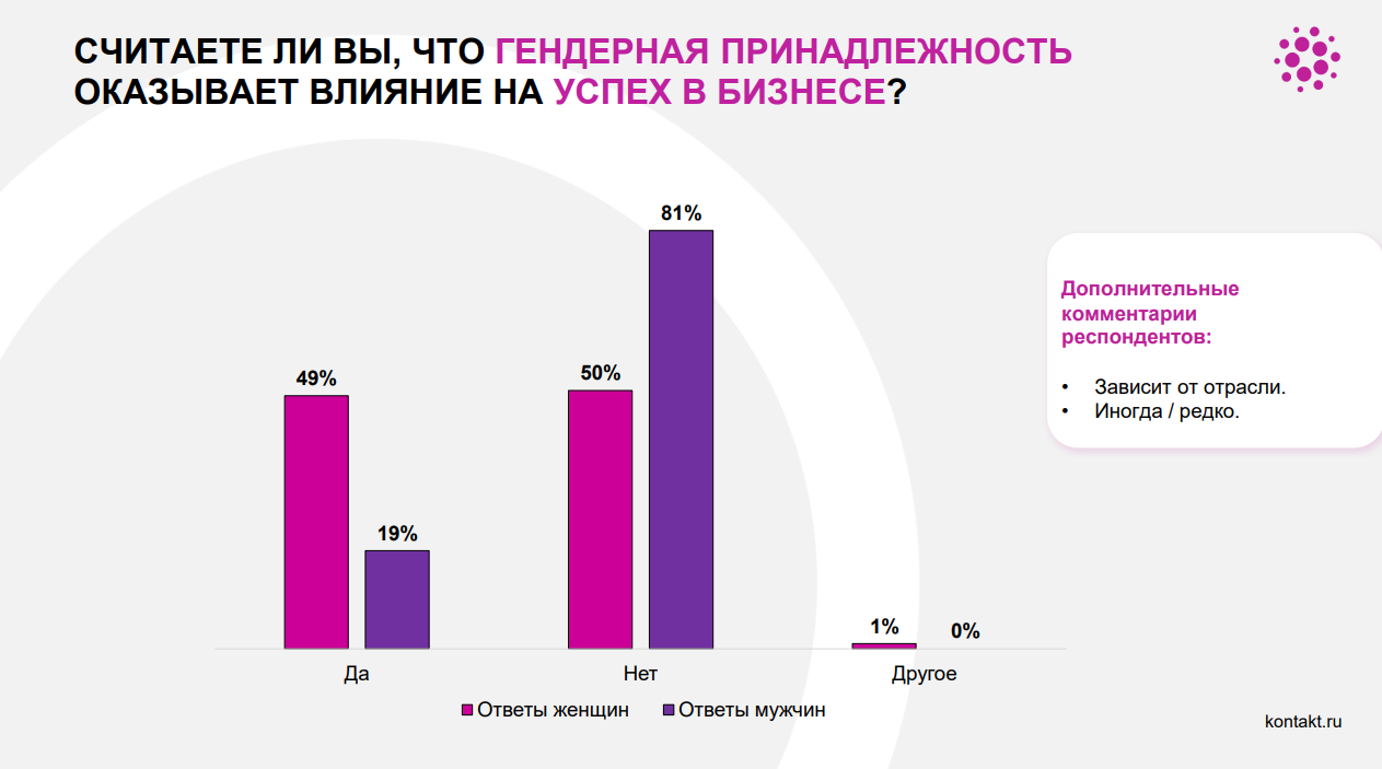 Почти 50% женщин и 19% мужчин уверены, что гендерная принадлежностьоказывает влияние на успех в бизнесе. С гендерным неравенством на работе илипри приеме на работу хоть раз сталкивались 30% женщин и 19% мужчин, согласноисследованию Kontakt InterSearch Russia.