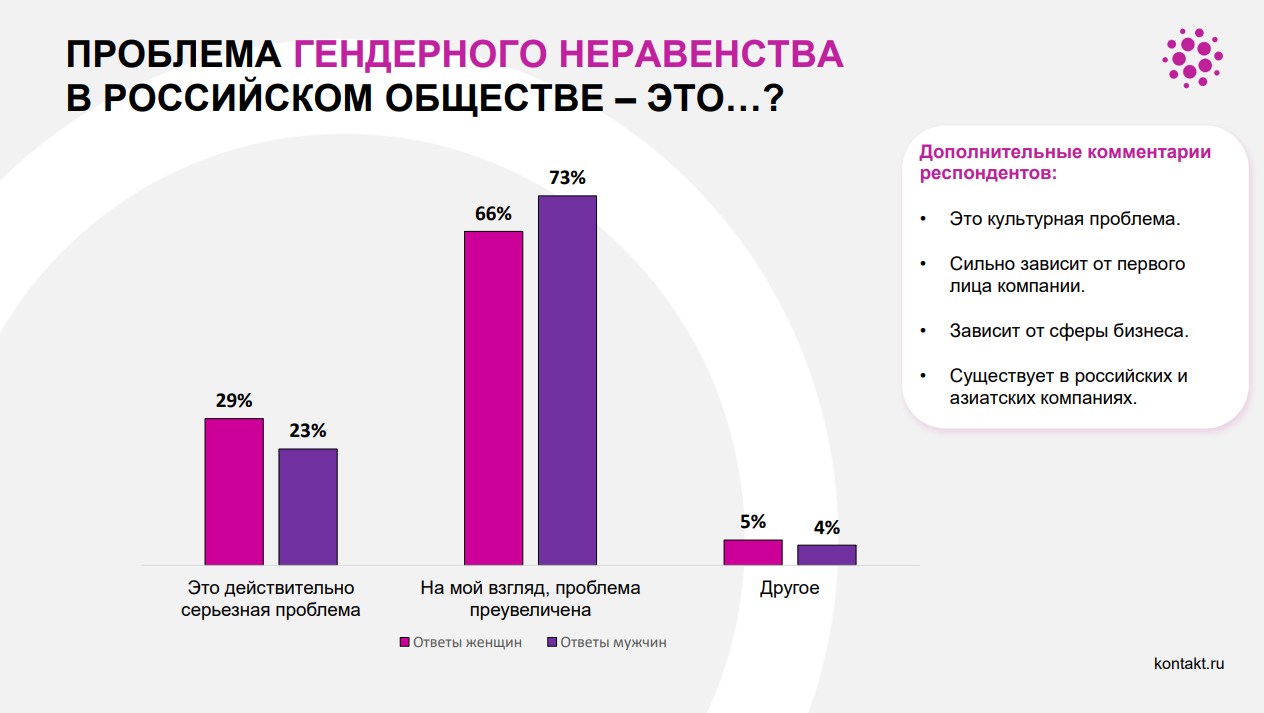 Однако 66% женщин и 73% мужчин считают, что вопрос гендерного неравенства вроссийском обществе преувеличен. Только 29% женщин и 23% мужчин полагают, чтоданная проблема достаточно серьезна. И 81% мужчин и 50% женщин не согласны, чтогендерная принадлежность оказывает влияние на успех в бизнесе.