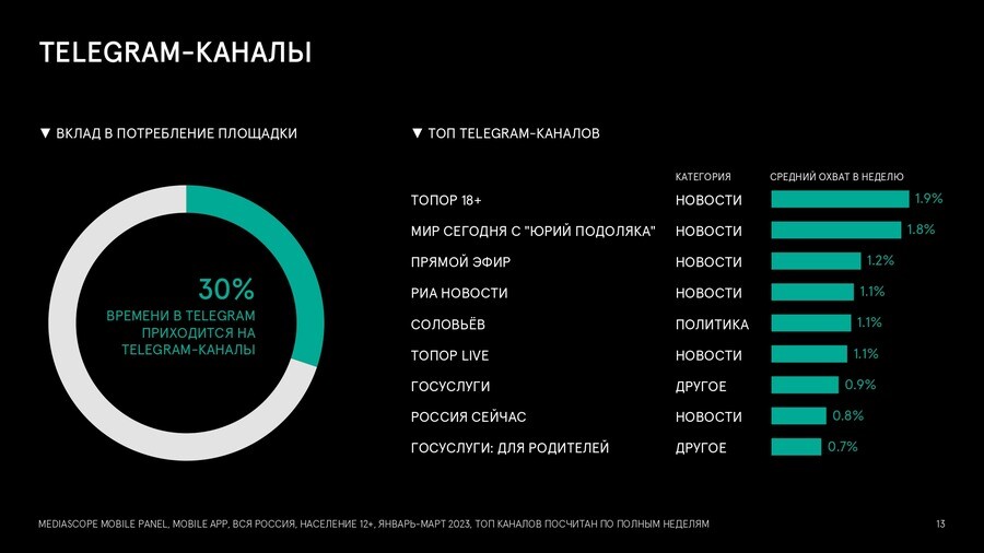 Наибольшим спросом в «Телеграм» пользуется новостная тематика. Эта тенденциясильнее проявляется среди пользователей в возрасте 25–34 лет, где эта категориязанимает 46%. При этом среди аудитории старше 45 лет более популяренполитический контент, а среди пользователей 35–44 лет — СВО (32%). В топ-9телеграм-каналов по недельному охвату вошли «Топор 18+», «Мир сегодня с “ЮрийПодоляка”», «Прямой эфир», РИА «Новости», «Соловьев».