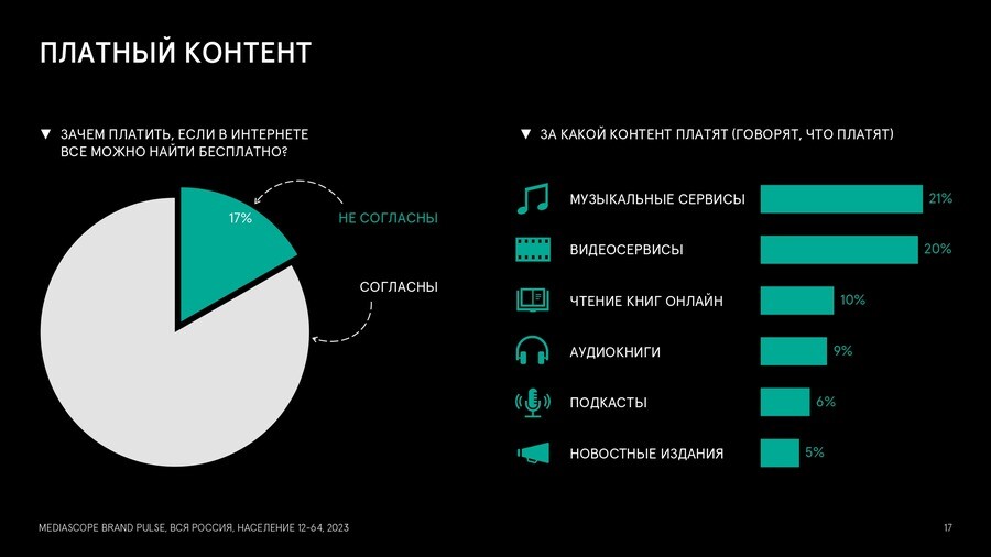 Россияне предпочитают оплачивать доступ к музыкальным (21%) и видеосервисам(20%). При этом 83% граждан от 12 до 64 лет считают, что нет смысла тратитьденьги на платный контент.