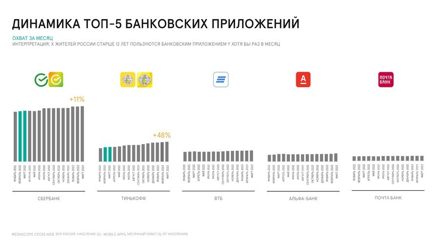 В топ-5 банковских приложений вошли «Сбербанк», «Тинькофф», ВТБ,«Альфа-банк», «Почта банк». Ежемесячная аудитория «Сбербанка» выросла на 11%,Тинькофф – на 48%. Остальные приложения вышли на плато по приростуклиентов.