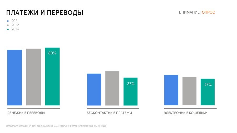 По данным опроса Mediascope, число клиентов бесконтактных платежейсократилось до 37% в 2023 г. Тенденция наиболее заметна среди представителеймолодых поколений. Количество потребителей бесконтактных платежей в возрасте от18 до 24 лет уменьшилось на 20% за последние полгода, среди 25-34 лет – на24%.
