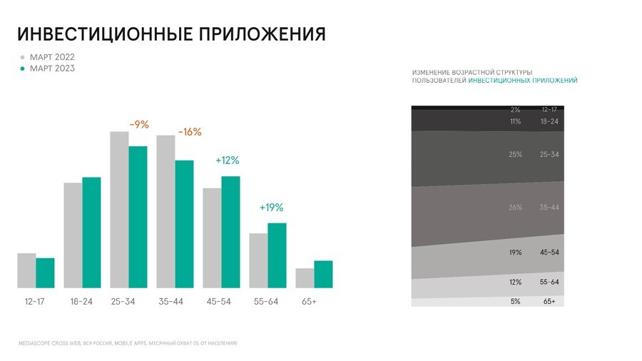Мартовский охват инвестиционных приложений показал отрицательную динамикусреди населения 25-34 лет и 35-44 лет, где показатель упал на 9% и 16%соответственно. Обратная тенденция наблюдается среди представителей старшихпоколений: в марте доля россиян, использующих инвестиционные приложения, ввозрасте 45-54 лет увеличилась на 12%, 55-65 лет – на 19%.