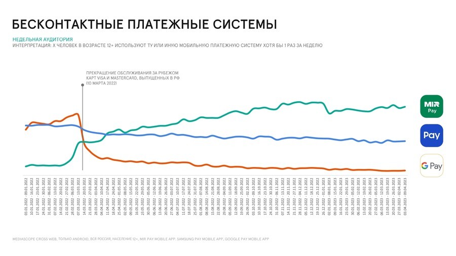 Заметно увеличилось использование Mir Pay после прекращения обслуживания зарубежом Visa и Mastercard, выпущенных в РФ. При этом сократилось потреблениеSamsung Pay и Google Pay.