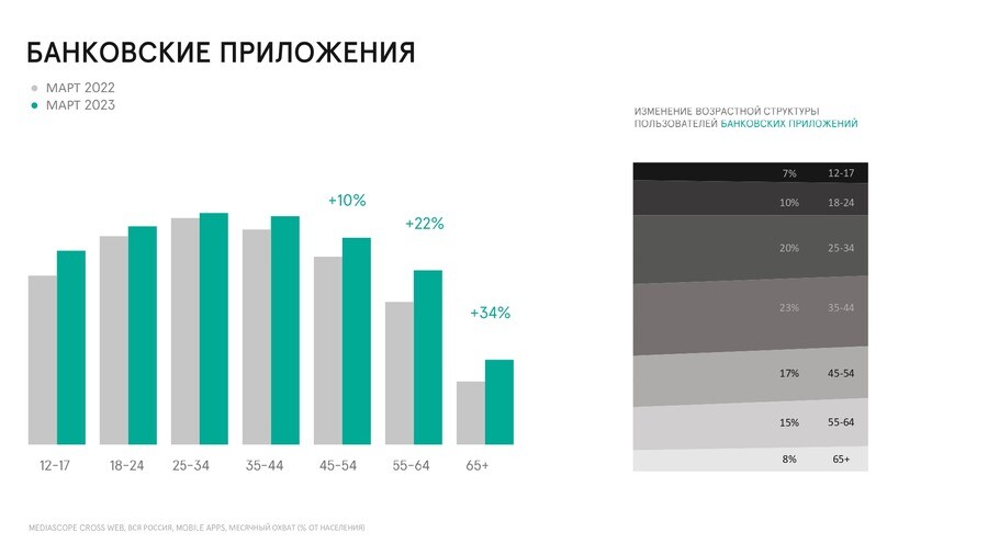 Охват банковских приложений за март среди пользователей старше 65 лет выросна 34% к тому же месяцу прошлого года. В этой аудитории показательпродемонстрировал наибольший прирост. Об этом сообщила руководитель сектораподдержки клиентов диджитал-сегмента Mediascope Наталья Бороздина на DigitalBrand Day во время презентации обзора финтех-трендов в медиапотреблении россиян2023 г.