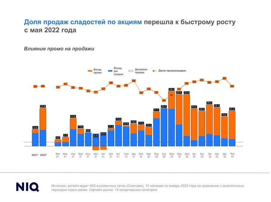 Развитие промопродаж в кондитерской индустрии обусловлено трендамипродовольственного рынка. Об этомговорится в аналитическом отчете NielsenIQ. Доля промовернулась к уровню докризисных значений летом 2022 г. Вклад промо в динамикугруппы достиг 58–59%, при этом вклад в динамику рынка стал ключевым, отметилиэксперты.