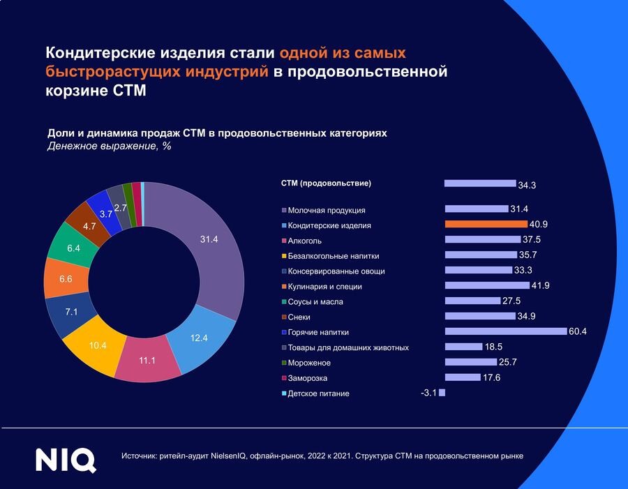 Темпы денежных продаж сладостей собственных торговых марок (СТМ) в 2022 г.выросли на на 40,9% к 2021 г. и заняли третье место средипродовольственных категорий. Доля кондитерских изделий частных марок составила12,4% в денежном выражении.