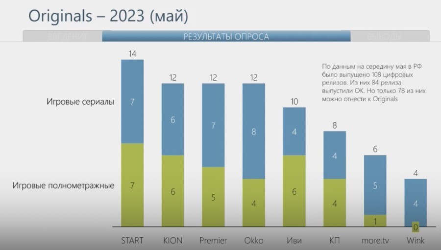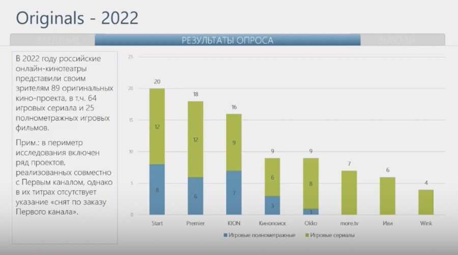 Лидером по производству оригинального контента остается онлайн-кинотеатрStart, который за 4,5 месяца выпустил семь фильмов и столько же сериалов.Второе место делят Kion, Premier, Okko, у каждого по 12 единиц оригинальногоконтента. Далее идут «Иви», «Кинопоиск», more.tv, Wink.