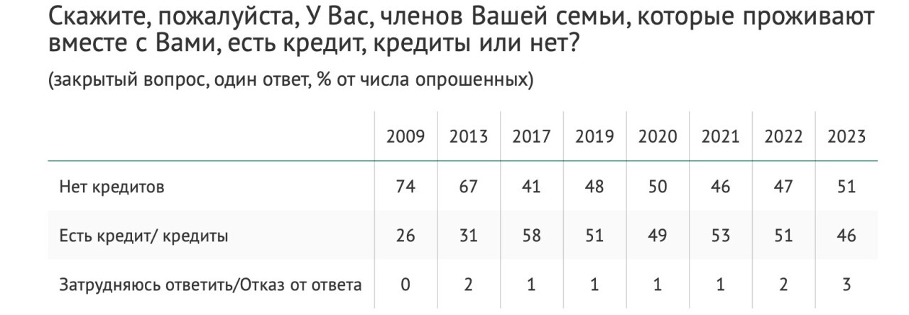 За последние десять лет кредитная активность россиян увеличилась в 1,5раза — с 31 до 46%. Об этомговорится в результатах опроса Всероссийского центраизучения общественного мнения (ВЦИОМ).